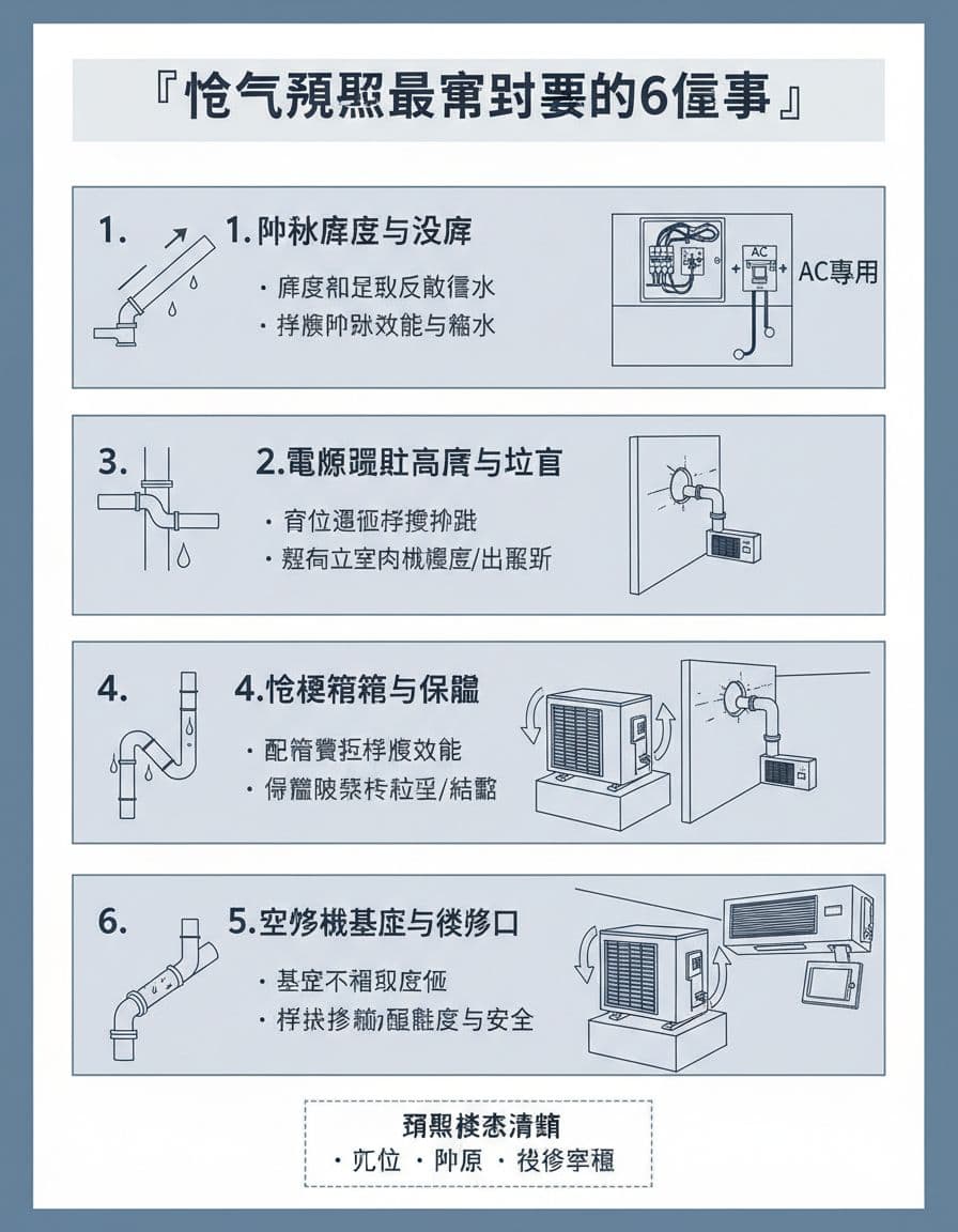 排水除了坡度,也常出錯在排放位置。把排水接到陽台地排或冷氣專用排水孔,通常比「直接排到外牆」更好控,也較不容易被風吹回。想快速理解漏水風險,可參考這篇整理冷氣漏水成因的文章:冷氣漏水常見眉角。