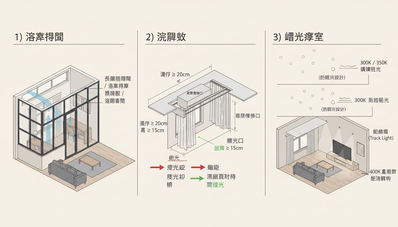 真正有效的室內採光改善,很少只靠「換燈泡」就解決。它比較像一套接力賽,自然光先進來,再被正確的隔間引導,最後用有層次的人工照明補齊死角。以下用玻璃隔間、窗簾盒、燈光層次三個做法,搭配常見失敗點,讓屋主在裝修前就能把坑避開。
