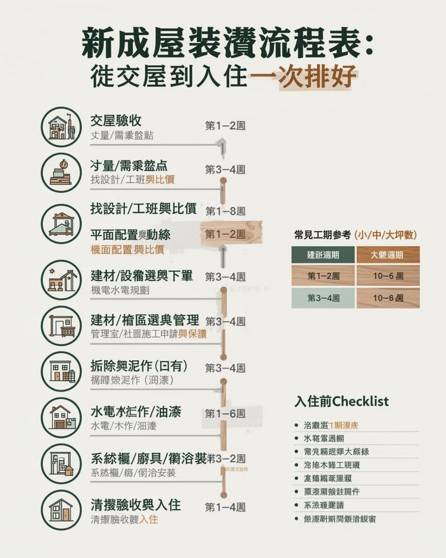 想更了解不同說法的流程順序,可參考新舊屋裝潢順序整理,再把它轉成自家專屬的節奏表,會更好落地。