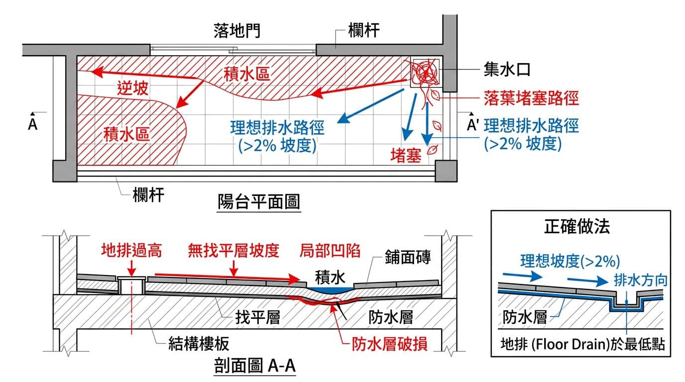 不過,坡度不是只看數字。若陽台面積大、地排在角落,必須用「多向收坡」把水導入集水點。反之,若只有單一方向坡,水容易被卡在對角。